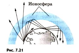 Короткие волны (диапазон длин волн от 10 до 100 м) распространяются на большие расстояния только за счет многократных отражений от ионосферы и поверхности Земли (рис. 7.21). Радиоволны в этом диапазоне оказываются «запертыми» в тонком слое, ограниченном поверхностью Земли и ионосферой. В результате волны, излучаемые радиостанцией, расположенной, например, в центре Азии, достигают радиоприемников в Южной Америке. Длинные радиоволны для этой цели менее пригодны из-за значительного поглощения поверхностными слоями Земли и ионосферой. И все же наиболее надежная радиосвязь на ограниченных расстояниях при достаточной мощности передающей радиостанции обеспечивается на длинных волнах. Ультракороткие радиоволны (λ < 10 м) проникают сквозь ионосферу и почти не огибают поверхность Земли. Поэтому они используются для радиосвязи между пунктами в пределах прямой видимости, а также для связи с космическими кораблями. Для космической радиосвязи используются спутники связи, сигналы которым посылаются передатчиком с Земли. Спутник принимает сигнал и посылает его другой наземной станции, находящейся на огромном расстоянии от первой. Принятые сигналы усиливаются и посылаются приемникам других станций. В последнее время сделано много попыток обнаружения других цивилизаций и передачи им сигналов. Отправлены сообщения с больших радиотелескопов, в которых содержатся формулировки математических теорем, физических законов, сведения о человеке и т. д. Однако можно сказать, что наиболее мощным сигналом, переданным во Вселенную, является колоссальный рост интенсивности радиоизлучения вследствие развития на Земле телевидения и сотовой связи. Земля из ненаблюдаемого с других звезд объекта превратилась в яркую радиозвезду, непрерывно излучающую мощный поток радиоволн. Принцип сотовой связи. Сотовая телефонная связь основана на компьютерных системах, которые связывают номера абонентов и адреса наиболее близких ретрансляторов. Во время соединения компьютерная система находит оптимальный путь связи абонентов — последовательность передачи сигналов через выбранные ретрансляторы. Сотовый телефон абонента постоянно принимает сигнал ретранслятора, с которым он связан. При перемещении абонента происходит перерегистрация — привязка абонента к новому, ближайшему ретранслятору. Распространение радиоволн существенно зависит от их длины волны. Короткие волны (с длиной волны от 10 до 100 м) многократно отражаются от ионосферы и поверхности Земли. Длинные волны (λ > 100 м) «скользят» вдоль поверхности Земли. Ультракороткие радиоволны (λ < 10 м) проникают сквозь ионосферу.