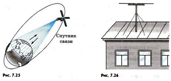 Глава 7. Электромагнитные волны § 58. Развитие средств связиЕще сравнительно недавно междугородная телефонная связь осуществлялась исключительно по проводам. При этом на надежность связи влияли грозы и возможность обледенения проводов. В настоящее время все шире применяются кабельные и радиорелейные линии, повышается уровень автоматизации связи. В радиорелейных линиях связи используются ультракороткие (дециметровые и сантиметровые) волны. Эти волны распространяются в пределах прямой видимости. Поэтому линии состоят из цепочки маломощных радиостанций, каждая из которых передает сигналы к соседней как бы по эстафете. Такие станции имеют мачты высотой 60—80 м, находящиеся на расстоянии 40—60 км друг от друга. Все большей популярностью пользуются оптоволоконные линии связи, позволяющие передавать большой объем информации. Процесс передачи основан на многократном отражении лазерного луча, распространяющегося по тонкой трубке (волокну). Такая связь возможна между двумя неподвижными объектами. Успехи в области космической радиосвязи позволили создать новую систему связи, названную «Орбита». В этой системе используются ретрансляционные спутники связи (рис. 7.25). Спутники связи серии «Молния» запускаются на сильно вытянутые орбиты. Период их обращения составляет около 12 ч. Созданы мощные и надежные системы, обеспечивающие телевизионным вещанием районы Сибири и Дальнего Востока. Они позволяют осуществить телефонно-телеграфную связь с отдаленными районами нашей страны. Новые спутники связи серии «Радуга» запускаются на орбиту радиусом около 36 000 км. На этой орбите период обращения спутника равен 24 ч, и поэтому спутник все время находится над одной и той же точкой поверхности Земли.