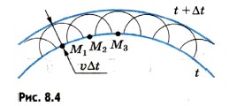 Глава 8. Световые волны § 60. Принцип Гюйгенса. Закон отражения светаЗаконы отражения и преломления света можно вывести из одного общего принципа, описывающего поведение волн. Этот принцип впервые был выдвинут современником Ньютона Христианом Гюйгенсом. Принцип Гюйгенса. Согласно принципу Гюйгенса каждая точка волнового фронта является источником вторичных волн. Для того чтобы, зная положение волновой поверхности (фронта волны) в момент времени t, найти ее положение в следующий момент времени t + Δt, нужно каждую точку фронта рассматривать как источник вторичных волн. Точки M1, М2, М3 и т. д. являются такими источниками. Поверхность, касательная к фронтам вторичных волн, представляет собой фронт первичной волны в следующий момент времени (рис. 8.4). Этот принцип в равной мере пригоден для описания распространения волн любой природы: механических, световых и т. д. Гюйгенс сформулировал его первоначально именно для световых волн.