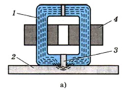Запись звука производят на ленту с помощью электромагнита, магнитное поле которого изменяется в такт со звуковыми колебаниями. При движении ленты вблизи магнитной головки различные участки пленки намагничиваются. Схема магнитной индукционной головки показана на рисунке (1.29, а), где 1 — сердечник электромагнита; 2 — магнитная лента; 3 — рабочий зазор; 4 — обмотка электромагнита. При воспроизведении звука наблюдается обратный процесс: намагниченная лента возбуждает в магнитной головке электрические сигналы, которые после усиления поступают на динамик магнитофона. Тонкие магнитные пленки состоят из слоя ферромагнитного материала толщиной от 0,03 до 10 мкм. Их применяют в запоминающих устройствах электронно-вычислительных машин (ЭВМ). Магнитные пленки предназначены для записи, хранения и воспроизведения информации. Их наносят на тонкий алюминиевый диск или барабан. Информацию записывают и воспроизводят примерно так же, как и в обычном магнитофоне. Запись информации в ЭВМ можно производить и на магнитные ленты.