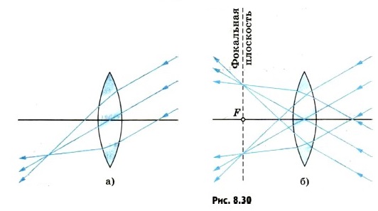 Направим три узких параллельных пучка лучей от осветителя под углом к главной оптической оси линзы. Мы увидим, что пересечение лучей произойдет не в главном фокусе, а в другой точке(рис. 8. 30, а). Но примечательно то, что точки пересечения независимо от углов, образуемых этими пучками с главной оптической осью, располагаются в плоскости, перпендикулярной главной оптической оси линзы и проходящей через главный фокус (рис. 8.30, б). Эту плоскость называют фокальной плоскостью.