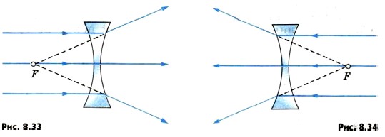 Линзы, которые посредине тоньше, чем у краев, называются вогнутыми. На рисунке 8.25 изображены три вида вогнутых линз: двояковогнутая — а, плосковогнутая — б и выпукло-вогнутая — в.