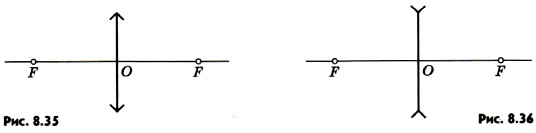 Глава 8. Световые волны § 64. Построение изображения в линзеРассмотрим способы построения изображения в линзе. Свойства тонкой линзы определяются главным образом расположением ее фокусов. Это означает, что, зная расстояние от источника света до линзы и ее фокусное расстояние (положение фокусов), можно найти расстояние до изображения, не рассматривая ход лучей внутри линзы. Поэтому нет необходимости изображать на чертеже точный вид сферических поверхностей линзы. Собирающую линзу обозначают символом, показанным на рисунке 8.35, а рассеивающую — символом, приведенным на рисунке 8.36. Нам уже известно, что все лучи, вышедшие из какой- либо точки предмета, пройдя сквозь линзу, пересекаются также в одной точке. Именно поэтому тонкая линза дает изображение любой точки предмета, а следовательно, и всего предмета в целом. Для построения изображений, получаемых с помощью собирающей линзы, фокусы и оптический центр которой заданы, мы будем пользоваться в основном тремя видами «удобных» лучей. Как было выяснено в предыдущем параграфе, лучи, параллельные главной оптической оси, преломившись в линзе, проходят через ее фокус. Из обратимости хода лучей следует, что лучи, идущие к линзе через ее фокус, после преломления будут направлены параллельно главной оптической оси. Наконец, лучи, проходящие через оптический центр линзы, не меняют своего направления.
