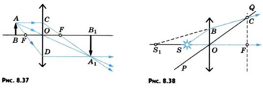 Построим изображение предмета АВ (рис. 8.37). Чтобы найти изображение точки А, направим луч АС параллельно главной оптической оси. После преломления он пройдет через фокус линзы. Другой луч — AD можно направить через фокус. После преломления он пройдет параллельно главной оптической оси. В точке пересечения этих двух преломленных лучей будет находиться изображение А1 точки А. Так же можно построить и все остальные точки изображения. Не следует только думать, что изображение создается двумя или тремя лучами; оно формируется всем бесчисленным множеством лучей, вышедших из точки А и собравшихся в точке Ах. В частности, в точку А1 попадает луч АОА1, прошедший через оптический центр О линзы. Таким образом, для построения изображения точки можно использовать любые два из трех «удобных» лучей, ход которых через линзу известен: 1) луч, проходящий через оптический центр; 2) луч, падающий на линзу параллельно главной оптической оси; 3) луч, проходящий через фокус. Изображение предмета АВ в этом случае будет действительным, перевернутым, увеличенным. Рассмотрим еще случай, когда необходимо построить изображение точки, расположенной на главной оптической оси. Трудность заключается в том, что все три «удобных» луча сливаются в один луч SF, совпадающий с главной оптической осью. Поэтому необходимо определить ход произвольного луча SB (рис. 8.38), попавшего на линзу в точке В.