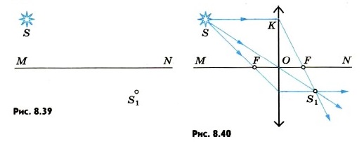 Глава 8. Световые волны Примеры решения задач. Упражнение 9Примеры решения задач1. На рисунке 8.39 показано расположение главной оптической оси MN линзы, светящейся точки S и ее изображения S1. Найдите построением оптический центр линзы и ее фокусы. Определите, собирающей или рассеивающей является эта линза, действительным или мнимым является изображение. Р е ш е н и е. Луч, проходящий через оптический центр линзы, не отклоняется от своего направления. Поэтому оптический центр О совпадает с точкой пересечения прямых SS1 и MN (рис. 8.40). Проведем луч SK, параллельный главной оптической оси. Преломленный луч KS1 пройдет через фокус. Зная, что луч, падающий на линзу через фокус, после преломления идет параллельно главной оптической оси, находим другой фокус. Линза является собирающей, а изображение — действительным.
