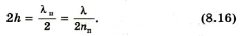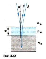 Разность хода световых волн 1 и 2 (см. рис. 8.51), отраженных от верхней и нижней поверхностей пленки, равна удвоенной толщине пленки 2h. Длина волны λп в пленке меньше длины волны λ в вакууме в nп раз: