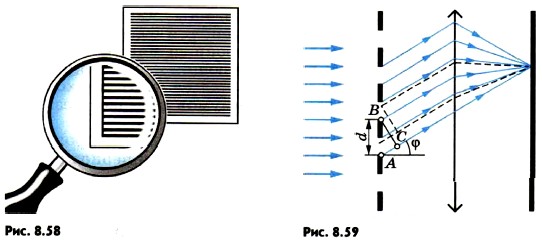 Глава 8. Световые волны § 72. Дифракционная решеткаНа явлении дифракции основано устройство оптического прибора — дифракционной решетки. Дифракционная решетка представляет собой совокупность большого числа очень узких щелей, разделенных непрозрачными промежутками (рис. 8.58). Хорошую решетку изготовляют с помощью специальной делительной машины, наносящей на стеклянную пластину параллельные штрихи. Число штрихов доходит до нескольких тысяч на 1 мм; общее число штрихов превышает 100 000. Просты в изготовлении желатиновые отпечатки с такой решетки, зажатые между двумя стеклянными пластинами. Наилучшими качествами обладают так называемые отражательные решетки. Они представляют собой чередующиеся участки, отражающие свет и рассеивающие его. Рассеивающие свет штрихи наносятся резцом на отшлифованную металлическую пластину. Если ширина прозрачных щелей (или отражающих свет полос) равна а, и ширина непрозрачных промежутков (или рассеивающих свет полос) равна 5, то величина d = а + b называется периодом решетки. Обычно период дифракционной решетки порядка 10 мкм. Рассмотрим элементарную теорию дифракционной решетки. Пусть на решетку (рис. 8.59) падает плоская монохроматическая волна длиной волны λ. Вторичные источники, расположенные в щелях, создают световые волны, распространяющиеся по всем направлениям. Найдем условие, при котором идущие от щелей волны усиливают друг друга. Рассмотрим, например, волны, распространяющиеся в направлении, определяемом углом φ.