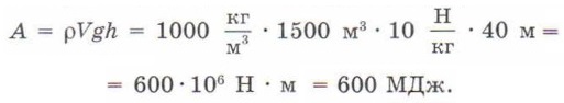С плотины гидроэлектростанции ежесекундно падает 1500 м3 воды. Какую работу совершает действующая на эту воду сила тяжести каждую секунду, если высота плотины 40 м? Р е ш е н и е. При падении тела массой m с высоты h сила тяжести mg совершает работу А = mgh. В данном случае масса тела — это масса воды, падающей в течение одной секунды. Поэтому m = ρV, где ρ — плотность воды, V — её объём. Получаем