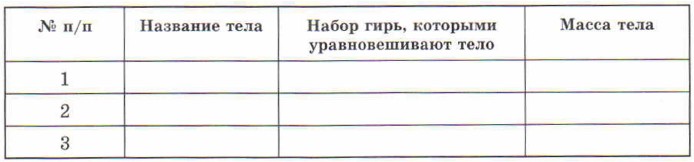 Лабораторная работа 5 Измерение массы телаЦель работы: научиться измерять массу тел с помощью рычажных весов. Оборудование: весы рычажные, набор гирь, несколько тел разной массы, сосуд с водой, стакан, пипетка. Ход работы 1. Проверьте, уравновешены ли весы. Если нет, то для уравновешивания положите на одну из чашек полоски бумаги или картона. 2. Поместите взвешиваемое тело на левую чашку весов. На правую чашку весов положите гирю наибольшей массы, которая не превышает массы взвешиваемого тела. Если гиря не уравновесила тело, добавьте на правую чашку весов гири в порядке уменьшения их массы (если правая чашка весов перевешивает, уберите последнюю из поставленных гирь). Мелкие гири (массой менее 10 г) берите пинцетом. 3. Добившись равновесия весов, подсчитайте общую массу гирь на правой чашке весов и оформите в виде таблицы: