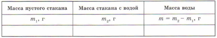 4. Перенесите гири с чашки весов обратно в футляр для гирь на предназначенные места. 5. Измерьте массу пустого стакана. Потом налейте в стакан воду и измерьте массу стакана с водой. Вычислите массу воды в стакане. Результаты оформите в виде таблицы: