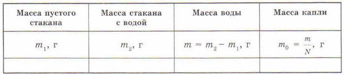 6. Вылейте из стакана воду в сосуд и отмерьте в стакан с помощью пипетки N = 100 капель воды. Измерьте массу стакана с водой. Исходя из полученных данных найдите массу одной капли. Результаты оформите в виде таблицы: