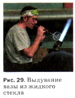 В отличие от твёрдых тел жидкости легко меняют свою форму. Они принимают форму сосуда, в котором находятся. Например, вода, наполняющая кувшин, имеет форму кувшина. Налитая же в стакан (бутылку), она принимает форму стакана (бутылки) (рис. 28). Но, изменяя форму, жидкость сохраняет свой объём. В обычных условиях только маленькие капельки жидкости имеют свою форму — форму шара. Это, например, капли дождя или капли, на которые разбивается струя жидкости. На свойстве жидкости легко изменять свою форму основано изготовление предметов из расплавленного стекла (рис. 29). Жидкости легко меняют свою форму, но сохраняют объём.