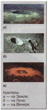 Марс — примерно в 2 раза меньше Земли. Очень похож на Землю по характеру процессов, происходящих в атмосфере. Средняя температура -60 °С, на полюсах до -150 °С (углекислый газ превращается в сухой лёд). Значительные запасы воды сосредоточены в слое вечной мерзлоты. Красноватая окраска планеты объясняется присутствием оксида железа. Юпитер — в 11 раз по диаметру больше Земли, обнаружены облачные образования в атмосфере, температура в центре около 30 000 °С, в недрах есть металлический водород с силикатами и металлами, которые и образуют ядро планеты. Ось планеты почти перпендикулярна к плоскости её орбиты, а это значит, что на Юпитере нет смены времён года.