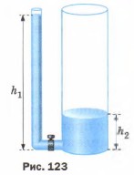 1. Подумайте, как можно простым способом устроить фонтан где-нибудь в парке или во дворе. Начертите схему такого устройства и объясните принцип его действия. Изготовьте модель фонтана. 2. На рисунке 122, (а) дана схема устройства шлюза, а на рисунке 122, (б) — схема шлюзования судов. Рассмотрите рисунки и объясните принцип действия шлюзов. Какое явление используется в работе шлюзов? 3. В два сосуда налита вода (рис. 123). В каком сосуде давление воды на дно больше и на сколько, если h1 = 40 см, a h2 = 10 см? В каком направлении и до каких пор будет переливаться вода, если открыть кран?