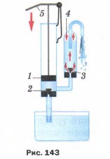 1. На какую предельную высоту вручную можно поднять воду поршневым насосом (см. рис. 142) при нормальном атмосферном давлении? 2. На какую наибольшую высоту вручную можно поднять спирт, ртуть поршневым насосом (см. рис. 142) при нормальном атмосферном давлении? 3. Объясните работу поршневого насоса с воздушной камерой (рис. 143), где 1 — поршень; 2 — всасывающий клапан; 3 — нагнетательный клапан; 4 — воздушная камера; 5 — рукоятка. Какую роль играет в этом насосе воздушная камера? Можно ли поднять этим насосом воду с глубины, большей 10,3 м?