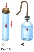 дой и частично воздухом так, чтобы она только немного выходила из воды. Сверху стеклянный сосуд плотно закрывали куском тонкой кожи. Нажимая на кожу, можно было заставить фигурку плавать в воде и на воде, а также тонуть. • Изготовьте такой прибор («картезианский водолаз») и проделайте с ним опыты. Фигурку замените небольшим поплавком, а сосуд закройте резиновой плёнкой (рис. 158, а. На рисунке 158, б изображён другой вариант этого прибора). • Объясните действие прибора. Продемонстрируйте на этом приборе законы плавания тел.