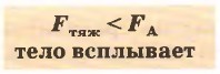 3) если сила тяжести Fтяж меньше архимедовой силы FA, mo тело будет подниматься из жидкости, всплывать, т. е. если