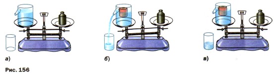 Упражнение 271. На весах уравновесили отливной сосуд с водой (рис. 156, а). В воду опустили деревянный брусок. Равновесие весов сначала нарушилось (рис. 156, б). Но когда вся вода, вытесненная плавающим бруском, вытекла из сосуда, равновесие весов восстановилось (рис. 156, в). Объясните это явление.