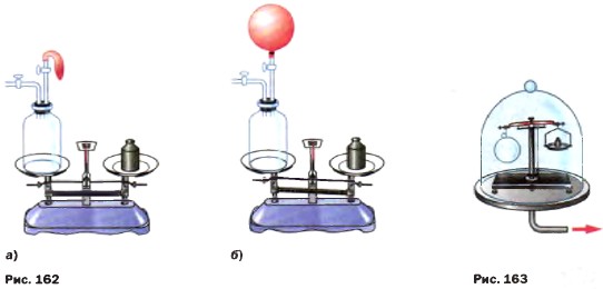 2. На весах уравновесили лёгкий стеклянный шарик. Затем весы поместили под колокол воздушного насоса и откачали воздух. Равновесие весов нарушилось (рис. 163). Почему? 3. Один шарик надут воздухом, другой — водородом, третий — углекислым газом. Какие шарики не взлетят? Объясните почему.