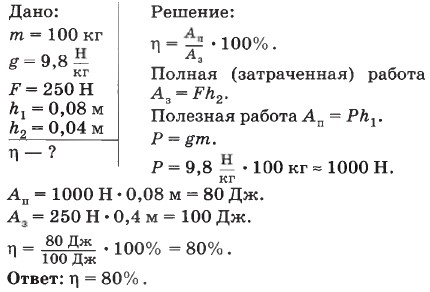 П р и м е р. На коротком плече рычага подвешен груз массой 100 кг. Для его подъёма к длинному плечу приложили силу 250 Н. Груз подняли на высоту h1 = 0,08 м, при этом точка приложения движущей силы опустилась на высоту h2 = 0,4 м. Найти коэффициент полезного действия рычага. Запишем условие задачи и решим её.