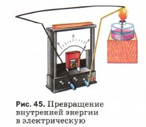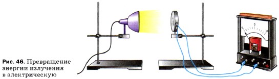 Можно осуществить и превращение внутренней энергии в электрическую. Если две проволоки, изготовленные из разных металлов, спаять, а затем нагреть место спая, то в проволоках возникнет электрический ток (рис. 45). Такой источник тока называется термоэлементом. В нём внутренняя энергия нагревателя превращается в электрическую энергию. При освещении некоторых веществ, например селена, оксида меди (I), кремния, наблюдается потеря отрицательного электрического заряда (рис. 46). Это явление называется фотоэффектом. На нём основано устройство и действие фотоэлементов. Термоэлементы и фотоэлементы изучают в курсе физики старших классов.