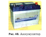 Когда аккумулятор зарядится, его можно использовать как самостоятельный источник тока. Полюсы аккумуляторов обозначены знаками « + » и «-». При зарядке положительный полюс аккумулятора соединяют с положительным полюсом источника тока, отрицательный — с отрицательным полюсом. Кроме свинцовых, или кислотных, аккумуляторов широко применяют железоникелевые, или щелочные, аккумуляторы. В них используется раствор щёлочи и пластины — одна из спрессованного железного порошка, вторая — из пероксида никеля. На рисунке 48 изображён современный аккумулятор. Аккумуляторы имеют широкое и разнообразное применение. Они служат для питания сети освещения железнодорожных вагонов, автомобилей, для запуска автомобильного двигателя. Батареи аккумуляторов питают электроэнергией подводную лодку под водой. Радиопередатчики и научная аппаратура на искусственных спутниках Земли также получают электропитание от аккумуляторов, установленных на спутнике. На электростанциях электрический ток получают с помощью генераторов (от лат. генератор — создатель, производитель). Этот электрический ток используется в промышленности, на транспорте, в сельском хозяйстве. Вопросы1. Что такое электрический ток?