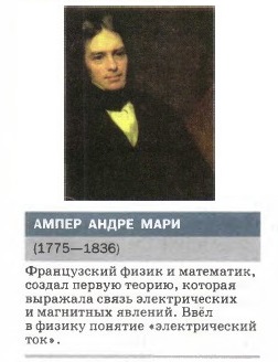 На Международной конференции по мерам и весам в 1948 г. было решено в основу определения единицы силы тока положить явление взаимодействия двух проводников с током. Ознакомимся сначала с этим явлением на опыте. На рисунке 60 изображены два гибких прямых проводника, расположенных параллельно друг другу. Оба проводника подсоединены к источнику тока. При замыкании цепи по проводникам протекает ток, вследствие чего они взаимодействуют — притягиваются или отталкиваются, в зависимости от направления токов в них. Силу взаимодействия проводников с током можно измерить. Эта сила, как показывают расчёты и опыты, зависит от длины проводников, расстояния между ними, среды, в которой находятся проводники, и, что самое важное для нас, от силы тока в проводниках. Если одинаковы все условия, кроме силы токов, то, чем больше сила тока в каждом проводнике, тем с большей силой они взаимодействуют между собой. Представим теперь себе, что взяты очень тонкие и очень длинные параллельные проводники. Расстояние между ними 1 м, и находятся они в вакууме. Сила тока в них одинакова. За единицу силы тока принимают силу тока, при которой отрезки таких параллельных проводников длиной 1 м взаимодействуют с силой 2 • 10-7 Н (0,0000002 Н). Эту единицу силы тока называют ампером (А). Так она названа в честь французского учёного Андре Ампера. Применяют также дольные и кратные единицы силы тока: миллиампер (мА), микроампер (мкА), килоампер (кА). 1 мА = 0,001 А;