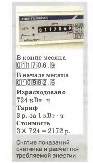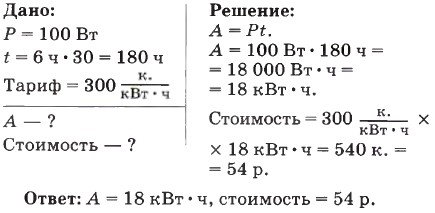 П р и м е р. Имеется электрическая лампа, рассчитанная на ток мощностью 100 Вт. Ежедневно лампа горит в течение 6 ч. Найти работу тока за один месяц (30 дней) и стоимость израсходованной энергии, считая, что тариф составляет 300 к. за 1 кВт • ч. Запишем условие задачи и решим её.