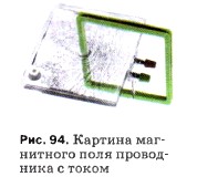 В магнитном поле опилки — маленькие кусочки железа — намагничиваются и становятся магнитными стрелочками. Ось каждой стрелочки в магнитном поле устанавливается вдоль направления действия сил магнитного поля. На рисунке 94 изображена картина магнитного поля прямого проводника с током. Для получения такой картины прямой проводник пропускают сквозь лист картона. На картон насыпают тонкий слой железных опилок, включают ток и опилки слегка встряхивают. Под действием магнитного поля тока железные опилки располагаются вокруг проводника не беспорядочно, а по концентрическим окружностям.