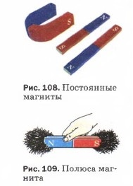 Французский учёный Ампер объяснял намагниченность железа и стали существованием электрических токов, которые циркулируют внутри каждой молекулы этих веществ. Во времена Ампера о строении атома ещё ничего не знали, поэтому природа молекулярных токов оставалась неизвестной. Теперь мы знаем, что в каждом атоме имеются отрицательно заряженные частицы — электроны. При движении электронов возникает магнитное поле, которое и вызывает намагниченность железа и стали. На рисунке 108 изображены дугообразный и полосовой магниты. Те места магнита, где обнаруживаются наиболее сильные магнитные действия, называют полюсами магнита (рис. 109). У всякого магнита, как и у известной нам магнитной стрелки, обязательно есть два полюса: северный (N) и южный (S).