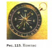 С глубокой древности известно, что магнитная стрелка, свободно вращающаяся вокруг вертикальной оси, всегда устанавливается в данном месте Земли в определённом направлении (если вблизи неё нет магнитов, проводников с током, железных предметов). Этот факт объясняется тем, что вокруг Земли существует магнитное поле и магнитная стрелка устанавливается вдоль его магнитных линий. На этом и основано применение компаса (рис. 115), который представляет собой свободно вращающуюся на оси магнитную стрелку.
