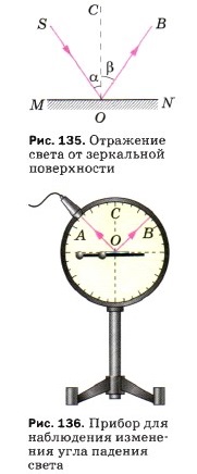 От источника S направим через щель пучок света на экран. Экран будет освещён, но между источником и экраном мы ничего не увидим (рис. 134, а). Теперь между источником и экраном разместим какой-либо предмет: руку, листок бумаги. В этом случае излучение, достигнув поверхности предмета, отражается, изменяет своё направление и попадает в наши глаза, т. е. он становится виден. Если запылить воздух между экраном и источником света, то становится видимым весь пучок света (рис. 134, б). Пылинки отражают свет и направляют его в глаза наблюдателя. Это явление часто наблюдается, когда лучи солнца проникают в запылённый воздух комнаты. Известно, что в солнечный день при помощи зеркала можно получить световой «зайчик» на стене, полу, потолке. Объясняется это тем, что пучок света, падая на зеркало, отражается от него, т. е. изменяет своё направление. Световой «зайчик» — это след отражённого пучка света на каком-либо экране. На рисунке 135 показано отражение света от зеркальной поверхности. Линия MN — поверхность раздела двух сред (воздух, зеркало). На эту поверхность из точки S падает пучок света. Его направление задано лучом SO. Направление отражённого пучка показано лучом ОB. Луч SO — падающий луч, луч ОB — отражённый луч. Из точки падения луча О проведён перпендикуляр ОС к поверхности MN. Угол SOC, образованный падающим лучом SO и перпендикуляром, называется углом падения (α). Угол СОВ, образованный тем же перпендикуляром ОС и отражённым лучом, называется углом отражения (β).