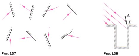 Угол падения α равен углу отражения β. ∠ α = ∠ β. Если луч падает на зеркало в направлении ВО (см. рис. 135), то отражённый луч пойдёт в направлении OS. Следовательно, падающий и отражённый лучи могут меняться местами. Это свойство лучей (падающего и отражённого) называется обратимостью световых лучей. Всякая незеркальная, т. е. шероховатая, негладкая, поверхность рассеивает свет, так как на ней имеются небольшие выступы и углубления. Такую поверхность можно представить в виде целого ряда малых плоских поверхностей, расположенных под разными углами друг к другу. Поэтому падающий на такую поверхность свет отражается по разным направлениям. Вопросы1. Пользуясь рисунком 135, расскажите содержание опытов, на основании которых были установлены законы отражения света. 2. Какой угол называют углом падения; углом отражения? Сформулируйте законы отражения света. 4 Какое свойство лучей называется обратимостью? Упражнение 451. Угол падения луча на зеркало равен 45°. Начертите отражённый луч. На этом же чертеже покажите расположение лучей для случая, когда угол падения равен 60°. 2. Угол падения луча на зеркало равен 0°. Чему равен угол отражения? 3. Перечертите в тетрадь рисунок 137. Постройте для каждого случая положение отражённого или падающего луча.