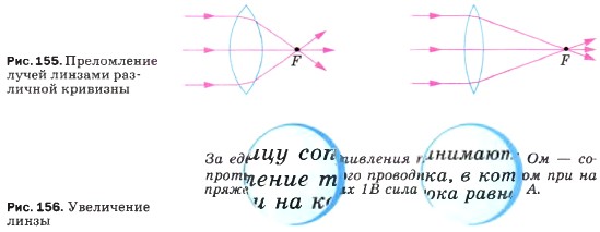 Линзы с более выпуклыми поверхностями преломляют лучи сильнее, чем линзы с меньшей кривизной (рис. 155). Если у одной из двух линз фокусное расстояние короче, то она даёт большее увеличение (рис. 156). Оптическая сила такой линзы больше. Линзы характеризуются величиной, которая называется оптической силой линзы. Оптическая сила обозначается буквой D.