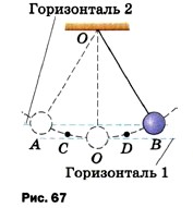 2. На рисунке 67 изображён шарик на нити, колеблющийся без трения между точками А и В. Находясь в точке В, этот маятник обладает потенциальной энергией, равной 0,01 Дж относительно горизонтали 1, принятой за нулевой уровень отсчёта потенциальной энергии. Чему равна: а) потенциальная энергия шарика в точках А и О; б) кинетическая энергия шарика в точках В, О и А; в) полная механическая энергия шарика в точках В, D,O,C и А? 3. Рассмотрите рисунок 56 и скажите, какие из тел способны совершать: свободные колебания; вынужденные колебания. Ответ обоснуйте. 4. Могут ли происходить: а) вынужденные колебания в колебательной системе; б) свободные колебания в системе, не являющейся колебательной? Приведите примеры.