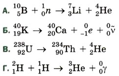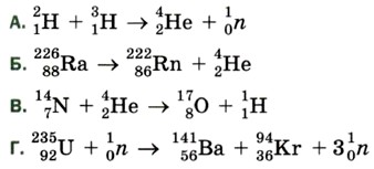 1. Регистрация частиц с помощью счётчика Гейгера, изучение и фотографирование треков частиц (в том числе участвовавших в ядерных реакциях) в камере Вильсона и пузырьковой камере. 2. Силы притяжения, действующие между нуклонами в ядрах атомов и значительно превосходящие силы электростатического отталкивания между протонами. 3. Минимальная энергия, необходимая для расщепления ядра на отдельные нуклоны. 4. Самопроизвольное излучение атомами некоторых элементов радиоактивных лучей. 5. Устройство, предназначенное для осуществления управляемой ядерной реакции. 6. Состоит из нуклонов (т. е. из протонов и нейтронов). 7. Радиоактивные отходы, возможность аварий, содействие распространению ядерного оружия. 8. Атом состоит из расположенного в его центре положительно заряженного ядра, вокруг которого на расстоянии, значительно превышающем размер ядра, обращаются электроны. 9. Превращение одного химического элемента в другой при α- или β-распаде, в результате которого ядро исходного атома претерпевает изменения. 10. Разность между суммой масс нуклонов, образующих ядро, и массой этого ядра. 11. Самоподдерживающаяся реакция деления тяжёлых ядер, в которой непрерывно воспроизводятся нейтроны, делящие всё новые и новые ядра. 12. Энергия ионизирующего излучения, поглощённая излучаемым веществом (в частности, тканями организма) и рассчитанная на единицу массы. Проверь себя1. α-Распад представлен уравнением реакции