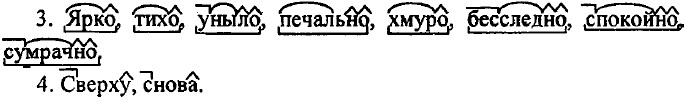 2. Ярко (образа действия), тихо (образа действия), сверху (места), снова (времени), уныло (образа действия), печально (образа действия), хмуро (образа действия), бесследно (образа действия), спокойно (образа действия), сумрачно (образа действия).