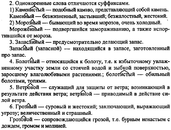 Упр. 56 (44). 1) Это письмо будет безответным (письмо без ответа). — Это просто безответственное письмо (не несущее ответственности, автор письма не осознает ответственности). 2) Недавно на нашей улице построили высокий дом (большой по протяженности снизу вверх). — В Москве более десяти высотных домов (очень высоких, многоэтажных, превышающих максимальный уровень). 3) Правительство приняло генеральный план (главный, основополагающий план) по озеленению города. — Генеральский план (план, который выработал генерал) выглядел более проработанным. 4) С прежним классом мы проводим дружеские встречи (встреча старых друзей). — Россия и Франция провели дружественную встречу (взаимно благожелательную). 5) В этой книге представлено единственное мнение профессора Иванова (только одно мнение). — Участники встречи пришли к единому мнению (сходное, одинаковое мнение). 6) Зрительное восприятие (восприятие непосредственно глазами) играет огромную роль при просмотре фильмов. — Зрительское восприятие (оценка зрителей) отличалось от восприятия критиков. 7) В театре было искусное освещение (правильное, грамотное, достойное восхищения). — В тоннеле создадут искусственное освещение (освещение при помощи лампы и других осветительных приборов). 8) Грозная туча (устрашающая, тяжелая) надвигалась на город. — Грозовая туча (несущая грозу) рассеялась. Упр. 57 (45). 1. У нее был жалостный голос. 2. Ивана Ивановича считали жалостливым человеком. 3. День выдался дождливым. 4. Не забудь дождевой плащ. 5. Предоставьте, пожалуйста, отчетный доклад о проделанной работе. 6. Он обладал отчетливым произношением.