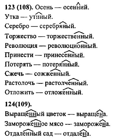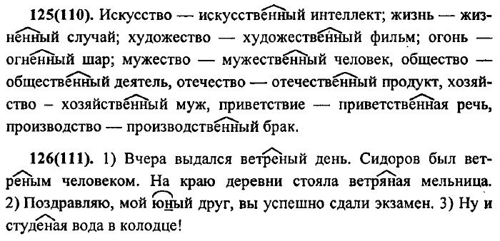 Язык и речь. Правописание. Культура речи § 7. Правописание: орфография и пунктуацияУпр. 106 (91). 1. Аккуратно — аккуратный, барьер — барьерный, вагон — вагонный, дисциплина — дисциплинарный, инженер — инженерный, коридор — коридорный, облачко — облако, парашют — парашютист, партер — партерный, панцирь — панцирный, фарфор — фарфоровый, шоссе — шоссейный. 2. Мальчик аккуратно переписал сочинение из черновика в тетрадь. У всех черепах панцирь очень прочный. Вагон был переполнен дачниками. Моя маленькая сестренка разбила фарфоровую чашку моей прабабушки. Упр. 107 (92). Пятачо́к — пя́ть, пя́тый, пя́тница, пя́тничный, пятью́. Мороз — морозом, морозец, морозит, морозить, морозом. Сердце — сердечный, сердец, сердечным, сердечник, бессердечный. Упр. 108 (93). Аллея, суффикс, территория, аккуратно, телеграмма, параллель, хоккей, ванна, диаграмма, коммуна, коммунист. Эти слова произношением проверить нельзя. Упр. 109 (94). Определить написание данных слов вне контекста нельзя. Слизать остатки мороженного (доесть) — слезать с дерева (спуститься вниз); отварить суп (приготовить) — отворить дверь (открыть); выпеченный каравай (сделанный в печи) — выпяченная грудь (выставленная напоказ); посветить фонариком (направить луч света) — посвятить жизнь чему-либо (полностью отдаться чему- либо); запивать лекарство (употреблять жидкость) — запевать песню (начинать петь); изжевать жевательную резинку (доесть до конца) — изживать соседа из комнаты (мешать жить); обвивать руками шею (обнимать) — обвевать воздухом (дуть); настигать противника (догонять) — настегать за провинность (наказать); примирять друзей (прекращать ссору) — примерять платье (одевать на себя); проживать в Москве (постоянно находится) — прожевать банан (съесть); разредить обойму (сделать пустой) — разрядить обстановку (сделать спокойной); свела старых друзей (сблизила) — свила клубок (собрала воедино); спеши в школу (не опаздывай) — спиши задание (перенеси на бумагу); увидать друга (увидеть) — увядать в одиночестве (чахнуть); чистота в комнате (отсутствие грязи) — частота колебаний (повторяемость во времени).