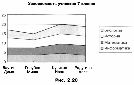 Глава 2. Информационное моделирование § 2.9. Графики и диаграммыВизуализация многорядных данныхПредположим, классный руководитель предложил вам подготовить к родительскому собранию диаграмму об успеваемости на основании информации, представленной в следующей таблице: