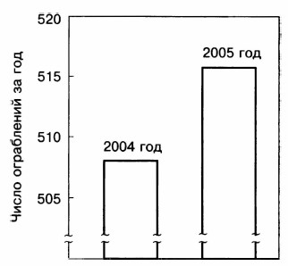 Что вы можете сказать, анализируя эту диаграмму? 7. В одном из телевизионных ток-шоу ведущий продемонстрировал следующую диаграмму и сказал: «Диаграмма показывает, что по сравнению с 2004 годом в 2005 году резко возросло число ограблений».