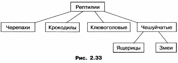 Иерархию легко изобразить «лесенкой» — в виде многоуровневого списка. Объекты одного уровня иерархии располагаются на одном уровне в списке. Чем ниже уровень иерархии, тем правее находится соответствующий уровень списка: Рептилии