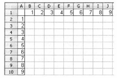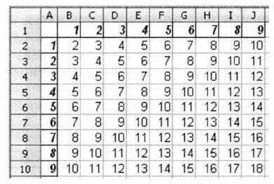 При заполнении любой ячейки этой таблицы складываются соответствующие ей значения ячеек столбца А и строки 1. Иначе говоря, у первого слагаемого неизменным остаётся имя столбца (на него следует дать абсолютную ссылку), но изменяется номер строки (на неё следует дать относительную ссылку); у второго слагаемого изменяется номер столбца (относительная ссылка), но остаётся неизменным номер строки (абсолютная ссылка). Внесите в ячейку В2 формулу =$А2+В$1 и скопируйте её на весь диапазон В2:J10. У вас должна получиться таблица сложения, знакомая каждому первокласснику.