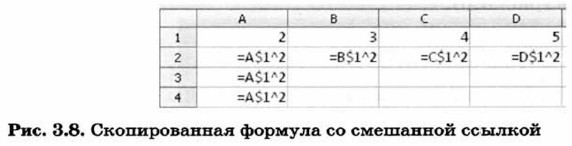 Смешанные ссылки. Смешанная ссылка содержит либо абсолютно адресуемый столбец и относительно адресуемую строку ($А1), либо относительно адресуемый столбец и абсолютно адресуемую строку (А$1). При изменении позиции ячейки, содержащей формулу, относительная часть адреса изменяется, а абсолютная часть адреса не изменяется. При копировании или заполнении формулы вдоль строк и вдоль столбцов относительная ссылка автоматически корректируется, а абсолютная ссылка не корректируется (рис. 3.8).