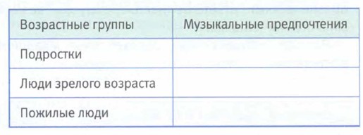 Основные термины и понятия Возрастной статус, возрастная роль, поколение. Проверьте свои знания 1. Какие этапы жизни проходит человек? В чём их особенности? 2. Как называется ваш возрастной период? Дайте его характеристику с учётом материала учебника и вашего собственного опыта. 3. Сравните возможности и ограничения следующих возрастных периодов: подростковый возраст и зрелость; подростковый возраст и старость. 4*. Согласны ли вы с утверждением, что «каждый возраст хорош по-своему»? Свой ответ обоснуйте. Практикум 1. Какое слово(-а) — «влияет» или «не влияет» — пропу- щено(-ы) в предложении? Аргументируйте свой выбор. «Мой возраст__________ на моё социальное положение ». 2. В одной фантастической повести ю-летний мальчик по волшебству был превращён во взрослого человека. Как вы думаете, с какими трудностями ему пришлось столкнуться и почему? 3. У каждой возрастной группы свои предпочтения, привычки и вкусы, в том числе музыкальные. Подумайте над музыкальными предпочтениями людей разного возраста. Своими словами опишите их музыкальные вкусы, характер и содержание исполняемых ими любимых песен. Заполните таблицу.