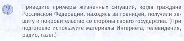 Документом, удостоверяющим гражданство и право получать все полагающиеся в связи с этим привилегии, служит паспорт. В России паспорт получают в 14 лет. Кстати, это уже второй документ, удостоверяющий ваше гражданство. Первый, как вы знаете, — свидетельство о рождении. Получив паспорт, юный гражданин России имеет право устроиться на работу, получать зарплату. Кроме того, несовершеннолетние россияне имеют право с согласия родителей заниматься предпринимательской деятельностью, открыть личный счёт в банке, а также право зарегистрировать своё изобретение, открытие, получать деньги за созданные ими литературные или музыкальные произведения, т.е. заявлять о праве на владение интеллектуальной собственностью. У гражданина есть права и обязанности. Основные права человека и гражданина и его обязанности перечислены в Конституции Российской Федерации (РФ). Например, гражданин должен соблюдать законы (постановления государственной власти, обязательные для исполнения), платить налоги, защищать своё Отечество, сохранять природу и бережно относиться к её богатствам — это обязанности.