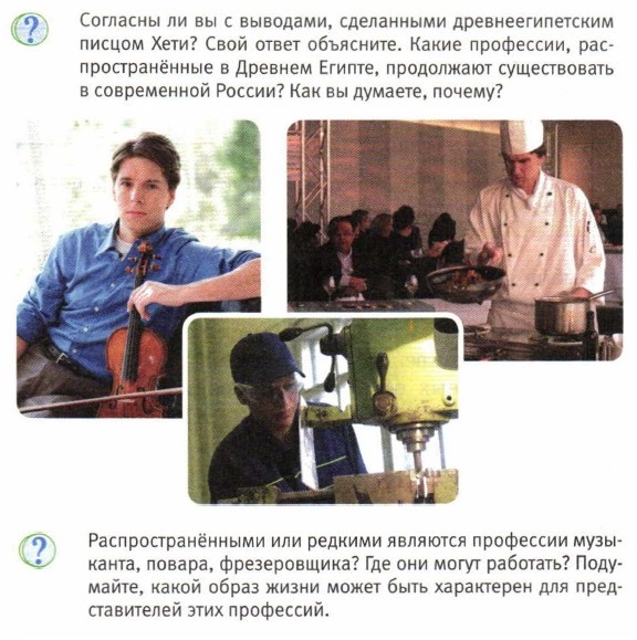 3. Прочитайте текст из дополнительного чтения на с. 35. Представители каких профессий, перечисленных древнеегипетским писцом Хети, занимаются физическим трудом, а каких — умственным? Как вы поняли его фразу «На этом свете нет праздных слов»? 4. Как труд связан с образом жизни человека? Приведите примеры. 5*. Почему работнику и работодателю обязательно нужно заключать трудовой договор? Практикум 1. Существует много пословиц о труде и лености: «Лентяй да шалопай — два родных брата», «Хочешь есть калачи, не лежи на печи», «Труд человека кормит, а лень портит». О каком отношении общества к труду говорят эти пословицы? Какие ещё пословицы о труде вы знаете? 2. Верно ли утверждение: «Труд не связан с историей и традициями того общества, в котором живёт человек»? Аргументируйте свой ответ. 3. Подготовьте сообщение для устного журнала «В мире профессий» об одной из профессий, связанных с экономикой. 4. Выбор профессии — очень важный шаг на жизненном пути. Расспросите у своих родителей, как у них он проходил. 5*. Сделайте компьютерную презентацию «Моя будущая профессия». В ней должно содержаться название, описание профессии и объяснение, почему вы её выбрали.