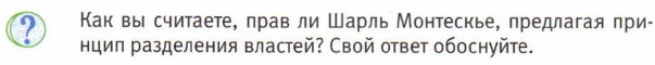 Законы (юридические нормы) принимает высший законодательный орган страны (парламент). Разработкой законов занимаются профессионально подготовленные люди. Законы исполняет высший исполнительный орган — правительство, в котором работают министры. Судьи входят в состав судебных органов власти. Таковы три главные ветви современной власти. Смысл разделения властей состоит в том, чтобы не допускать сосредоточений всей власти в руках какого- то одного органа. Это означает, что каждая власть независима от другой и может контролировать остальные ветви власти.