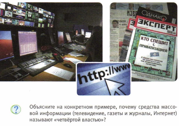 Принцип разделения властей, являющийся важным принципом демократии, был использован в конституциях многих государств, в том числе и в Конституции Российской Федерации. Государственная власть и общественная жизньГосударственная власть влияет на жизнь общества. Государство обеспечивает гражданам возможность выражать свою волю, создавать политические партии и профсоюзы, выбирать по своему усмотрению местные органы власти, проводить митинги и демонстрации. Через центральные каналы телевидения, радио и газеты государство влияет на наши умы и поведение. Но и общество, граждане могут влиять на государство, например участвуя в выборах (голосуя за тех или иных кандидатов) или в политических собраниях, поддерживая ту или иную партию денежными пожертвованиями, организуя новую политическую партию, предлагая политические реформы, выходя на улицу для участия в демонстрации. Простые граждане могут влиять на политику государства через средства массовой информации, выражая на страницах газет и журналов, в Интернете своё мнение по различным проблемам.