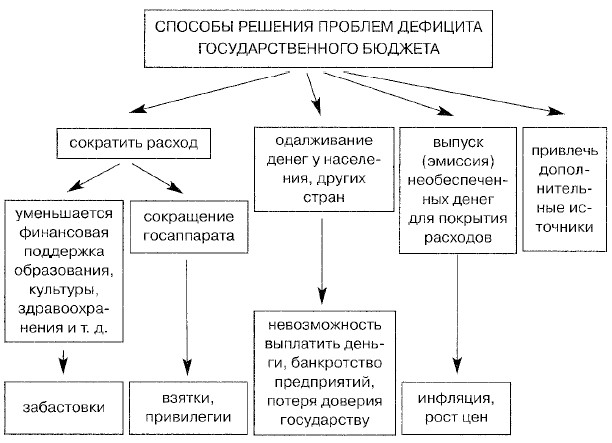 Когда доходы и расходы равны, бюджет называется сбалансированным. Когда доходы превышают расходы, эта разница является положительным сальдо (профицит бюджета). Когда бюджетные расходы больше доходов, то разница называется отрицательным сальдо, или дефицитом бюджета. Дефицит бюджета представляет собой государственный долг. Он может быть внешним — перед иностранными государствами, и внутренним — перед собственным народом. Второе означает, что государство постоянно берет деньги в долг у населения и не возвращает ему. Самый распространенный способ сделать это — выпустить ценные бумаги и не погасить их. Государственный долг — не такая безобидная вещь, как может показаться. Многие государства постоянно попадают в ситуацию, когда концы с концами в бюджете свести не удается и необходимые расходы оказываются больше возможных доходов. Государственное банкротство1. В 1 557 г. Испания и Франция объявили о государственном банкротстве, так как не могли выплатить проценты по кредитам. На чем же погорели монархи? На выборах. Испанская корона, чтобы финансировать выборы короля Карла I (Карл V) Габсбурга императором Священной Римской империи, брала займы, главным образом у крупных немецких банкиров Фуггеров. Часть долга была возмещена за счет предоставления им права на эксплуатацию серебряных и медных рудников. В момент объявления о банкротстве долг Фуггерам составлял 4 млн. золотых. При кредитной ставке в 5% долг по процентам, который надо было выплатить за год, равнялся примерно 5000 годовых жалований одного каменщика. 2. Собрание французских нотаблей в 1787 г. вынудило короля Людовика XVI отправить в отставку генерального контролера финансов Шарля Александра де Калонна, которому не удалось остановить рост государственного долга. Франции угрожало банкротство. Ежегодный дефицит составлял около 112 млн. франков. Чтобы решить проблему государственного долга, Учредительное собрание в 1 789 г. решило для уменьшения бюджетного дефицита национализировать имущество церкви. Эта мера также позволяла обеспечить содержание бумажных денег, выпускавшихся в большом количестве. Стремительный рост денежной массы повлек обвальную инфляцию, которая коснулась прежде всего мелкой буржуазии и беднейших слоев населения. Источник: Энциклопедия «Хроника человечества». Как сегодня справляются с дефицитом государственного бюджета? Мировая практика выработала четыре способа решения: 1) сокращение бюджетных расходов; 2) привлечение дополнительных источников; 3) выпуск (эмиссия) необеспеченных денег для покрытия расходов; 4) одалживание денег у населения и банков внутри страны либо у иностранных государств и финансовых организаций (фондов) и т.д.